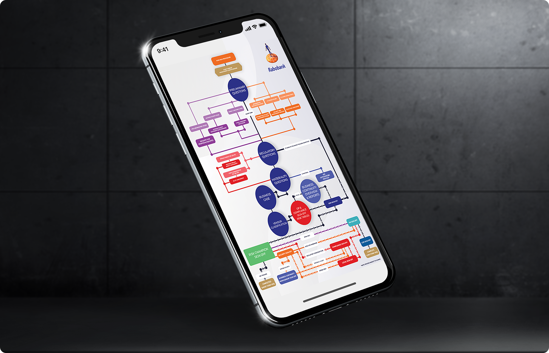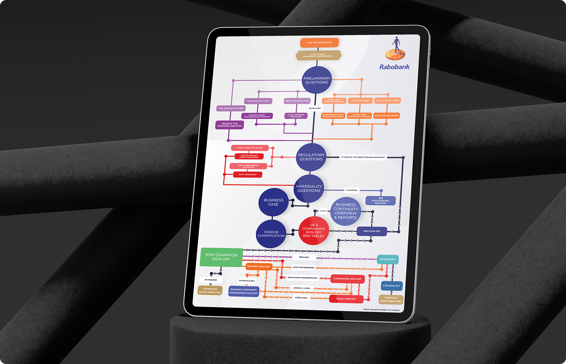 Rabobank, a global leader in agribusiness finance, needed a complex information flow turned into a single, clear visual piece. The goal was to communicate a detailed internal process — with multiple decision points and dependencies — in a way that was logical, accessible, and adaptable across print and digital formats. We collaborated closely with their team to refine structure, hierarchy, and flow, delivering a one-page infographic that brought order and clarity to an otherwise intricate process.